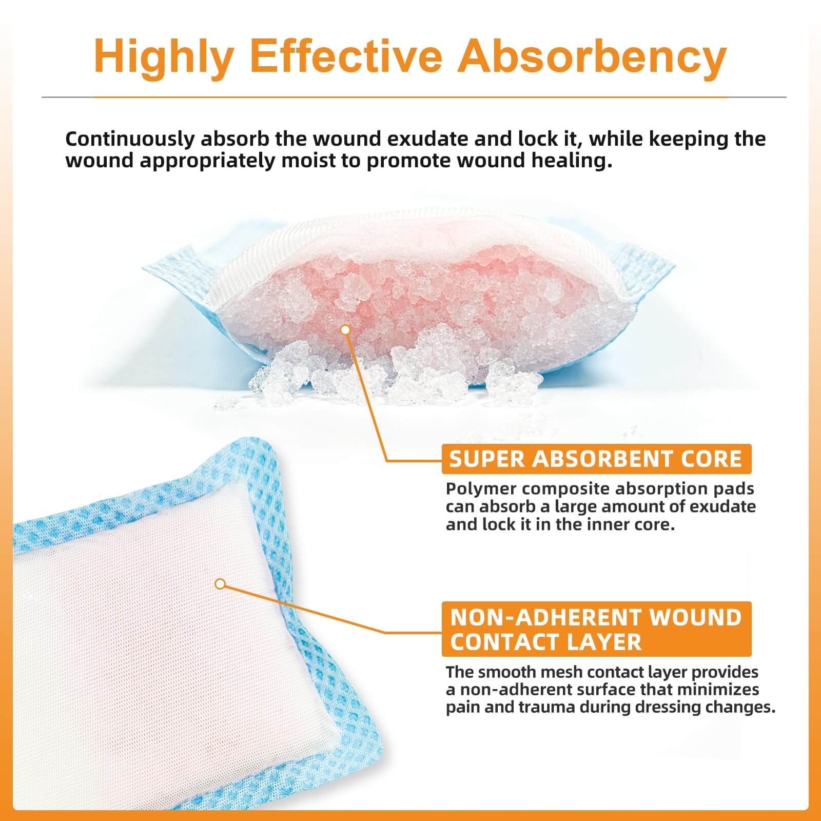 - Super Absorbent Dressing for Wound Care: This dressing is a multi-layer wound dressing with super absorbent ability, which is non adhesive, hydrophilic, and highly absorbent. Fully absorb wound secretions, reduce wound immersion, and provide a moist environment that helps maintain optimal conditions for wound care.